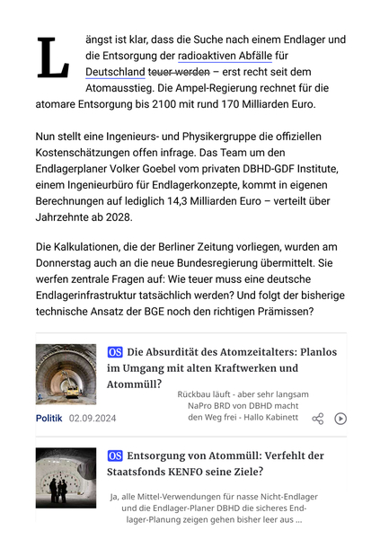 Lesen Sie zum Thema Napro BRD und Endlager-Kosten Artikel Berliner Zeitung