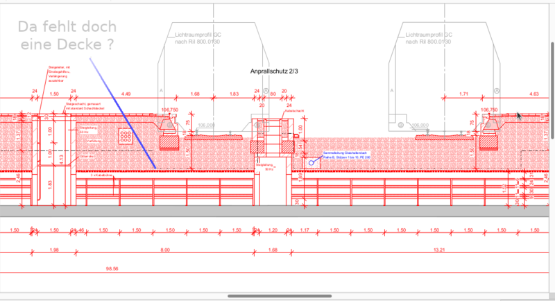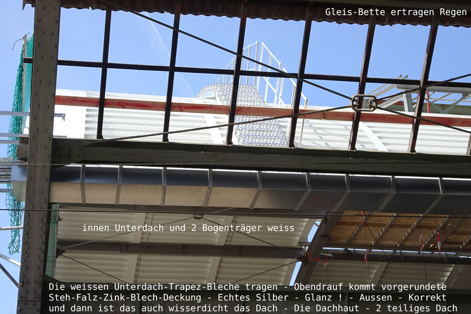 >>> Prüft ob der Regen im Gleisbett bleibt oder ob der Regen den Bahnsteig ein-nässt - Option - mit oder ohne transparente Eindeckung denken, planen, zeichnen, ausprobieren, prüfen ... Wir können das jedes Licht brauchen was baulich möglich ist. Makrolon-Oberlicht. Ganz leicht hellblau.