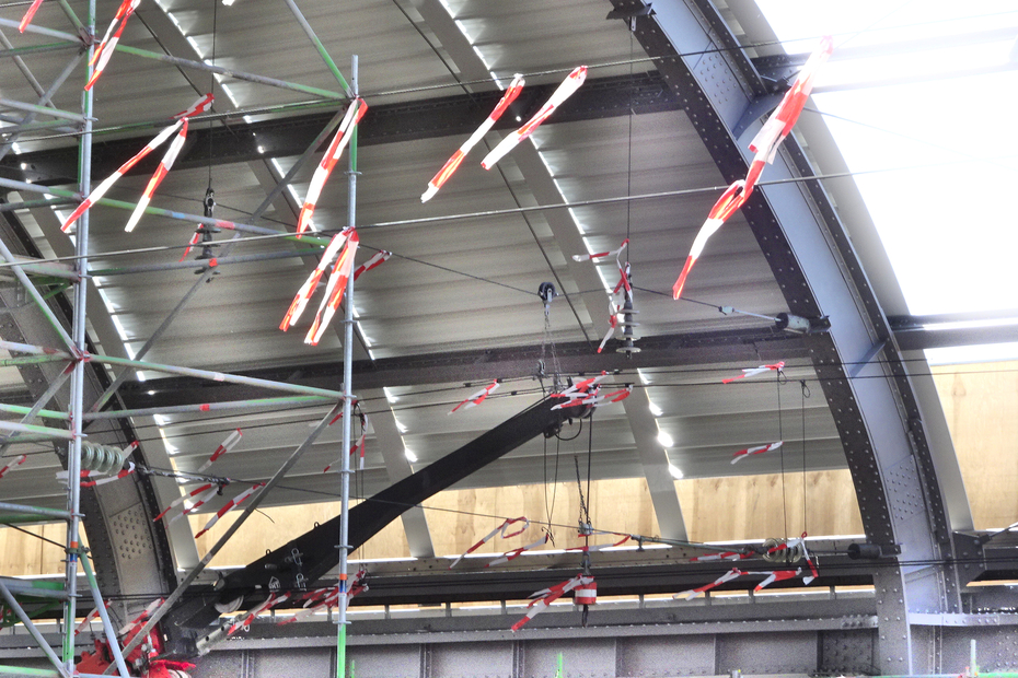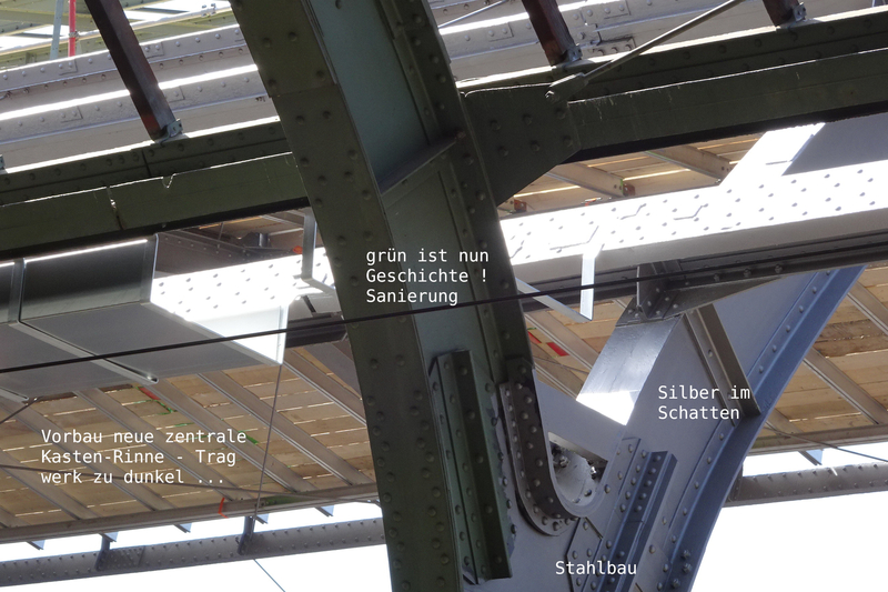 >>> Das Tragwerk erhält einen Farbwechsel von grün auf silber - Endlich wird es heller - aber im Schatten sieht das immer noch dunkelgrau aus - Das von VG geforderte Verkehrsweiss RAL 9016 verweigert diese Archäologin in der Denkmal-Behörde ! Grrrr !