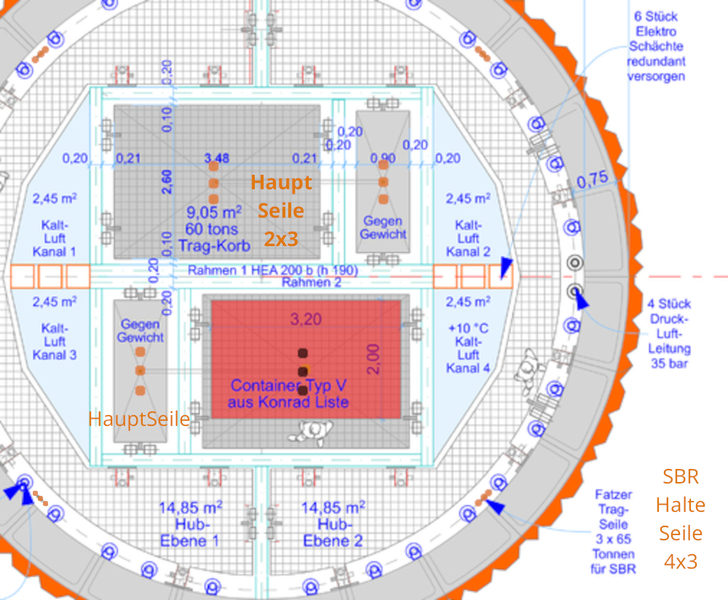 Die Winschen und Seile sind für jede Seite des Schachtes redundant zu planen.