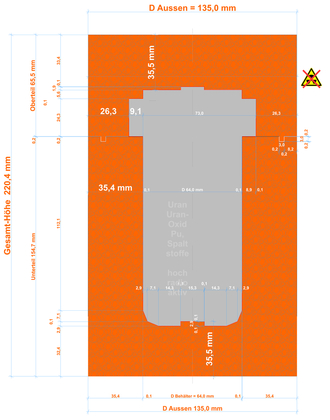 Und den Endlager-Behälter sogar mit Strahlen-Schutzhülle.