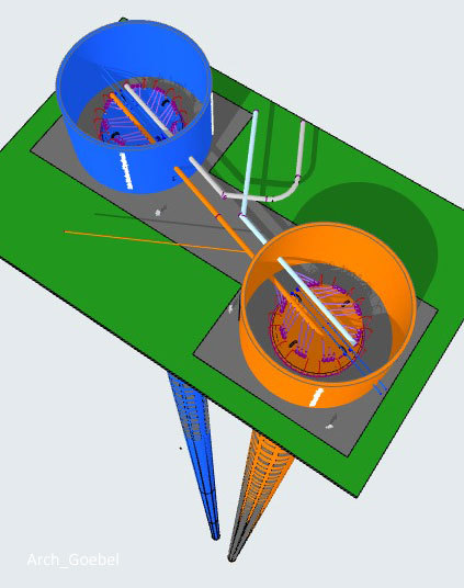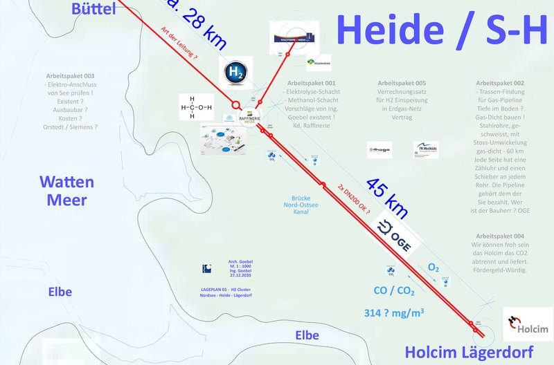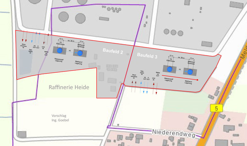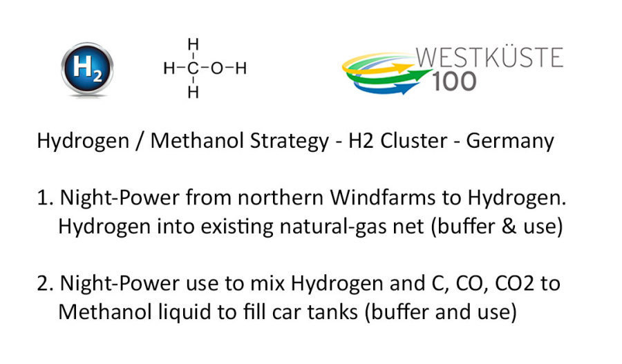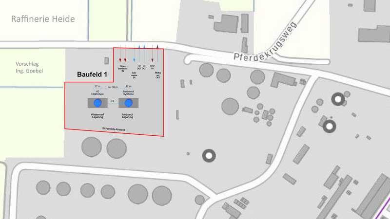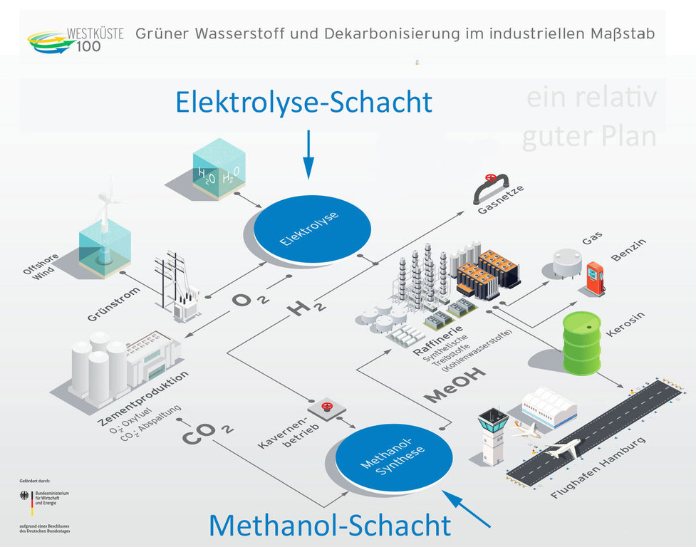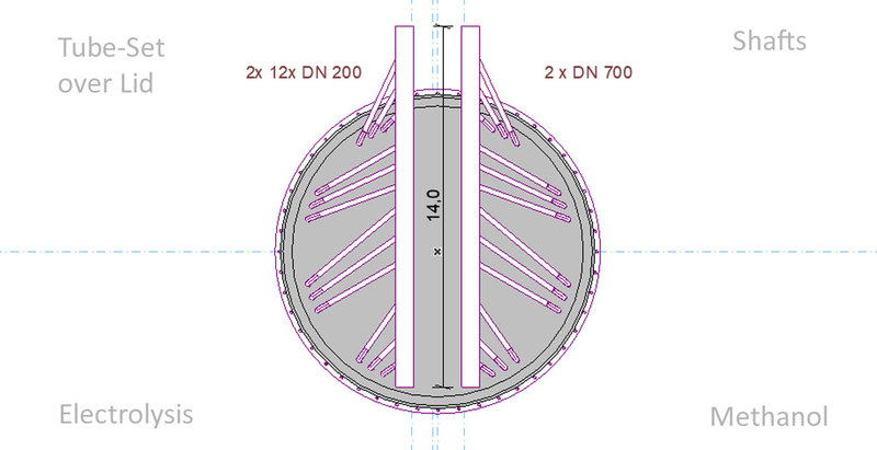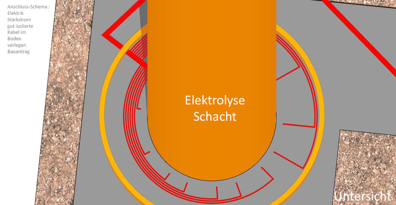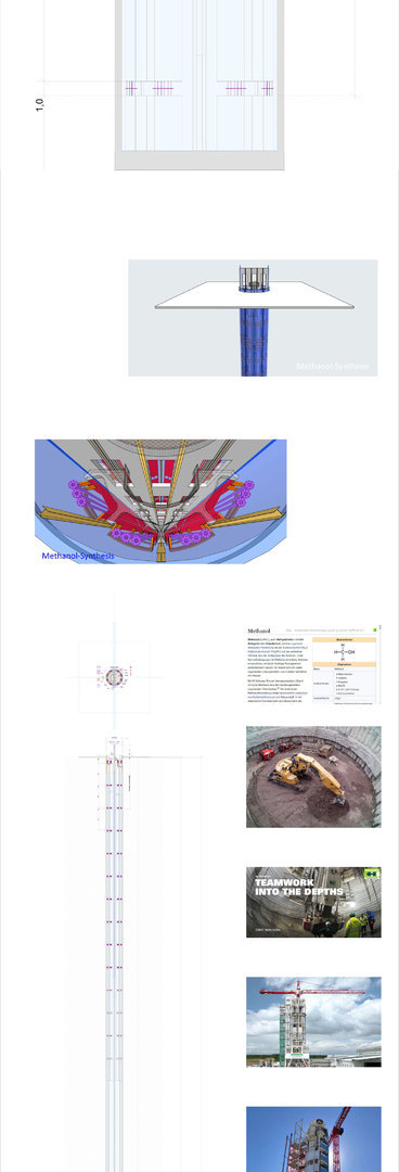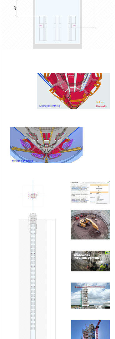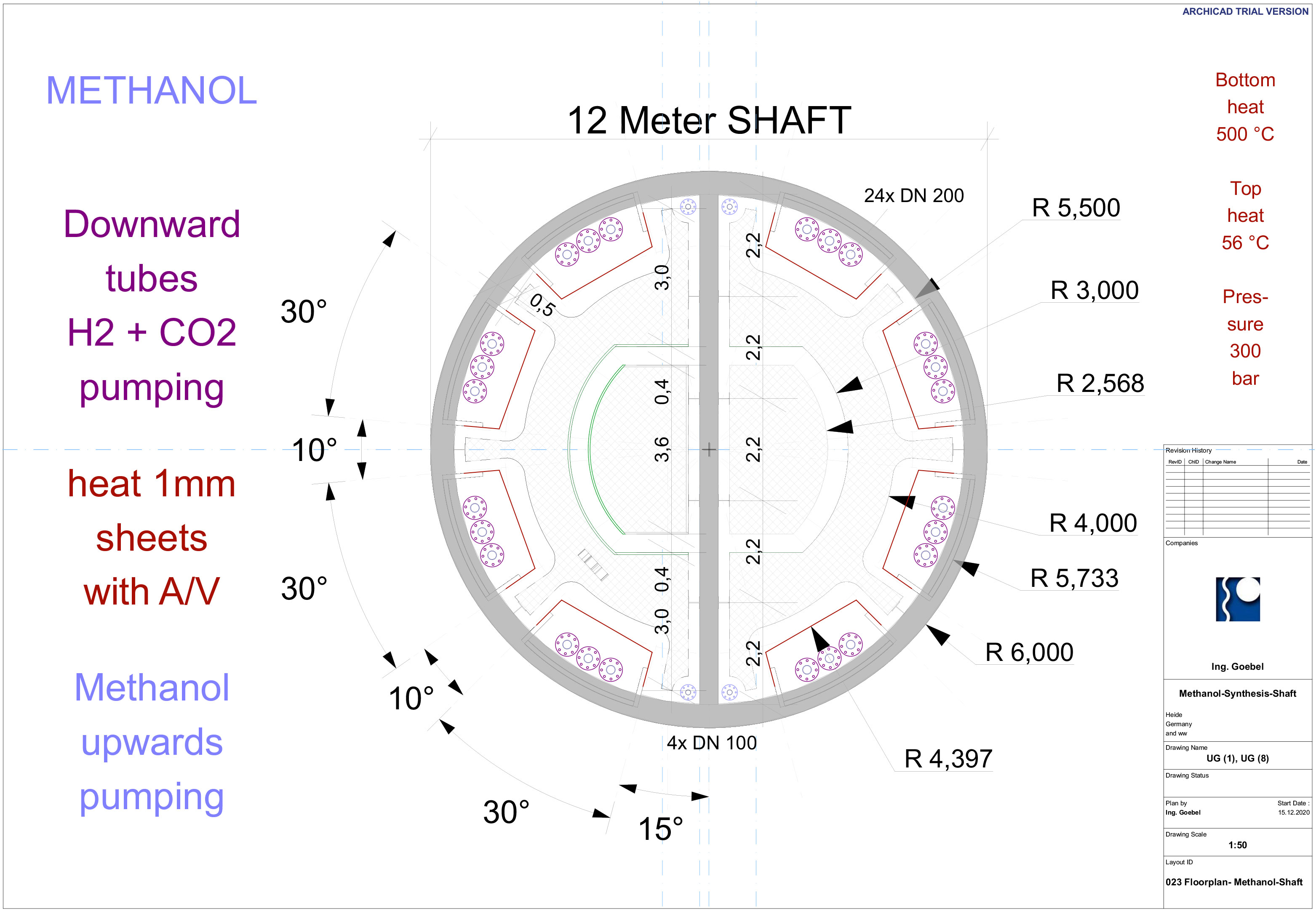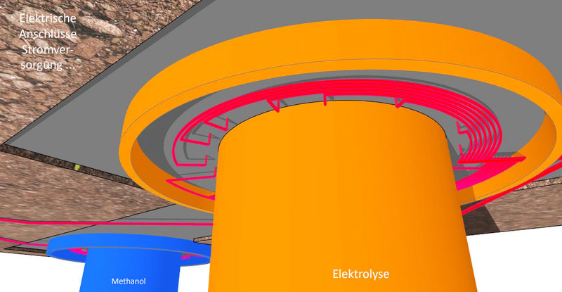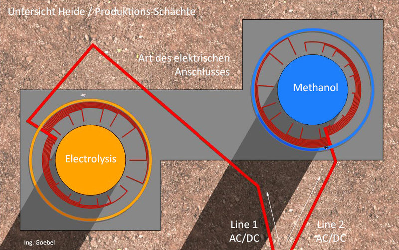 Es ist notwendig den Schacht-Ausbau so anzulegen das einzelne Anoden- und Kathoden-Ringe oder Segment-Bereiche einzeln elektrisch ansteuerbar sind. Ein kleiner Ofen hat unten heiss oben kalt. Ein tiefer langer Ofen hat mehrere kleine Ofen-Bereiche vertikal übereinander. - Dem müssen die Rohre für das Befüllen mit H2 und CO2 räumlich einigermassen folgen. Das unten eine Methalnol Säule steht ist gut. Dann hat man gleich einen Lagerplatz. Man muss das flüssige Methanol aber hochpumpen um es in Tankwagen abfüllen zu können. Erst mal einen 40 Meter tiefen Schacht baggern und ausbauen und in Betrieb nehmen. Den nicht benötigten Nachtstrom von den Windmühlen für die Methanol Synthese nutzen. - Tagsüber ins Netz - Nachts ins Methanol speichern.