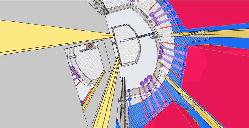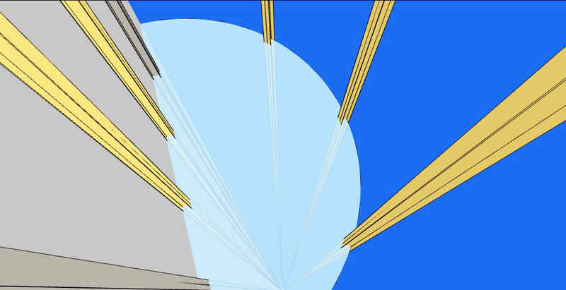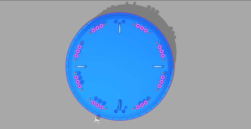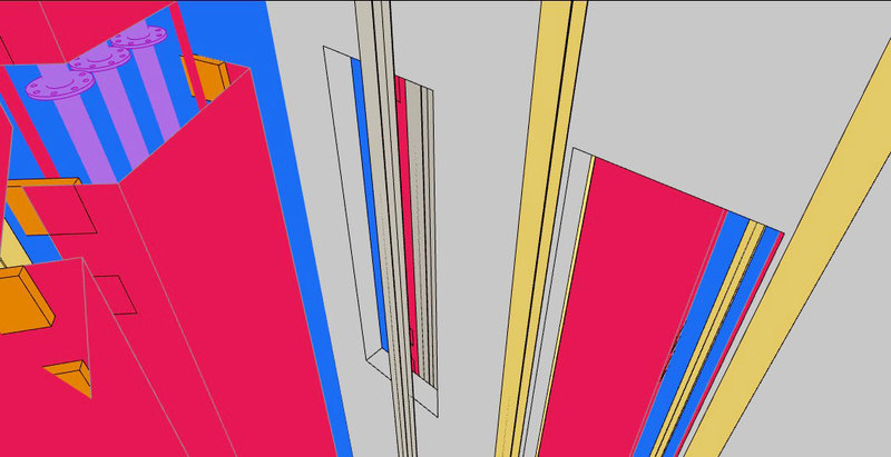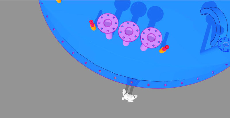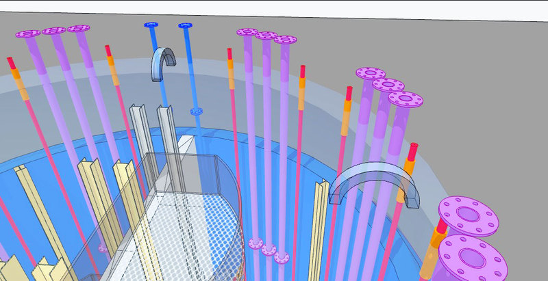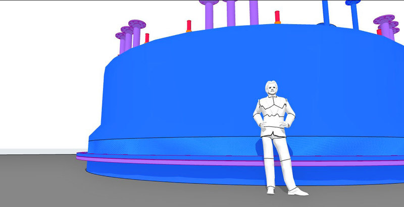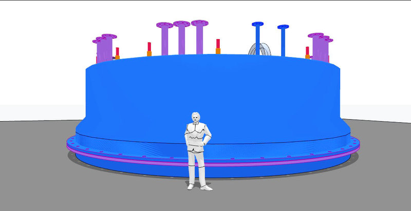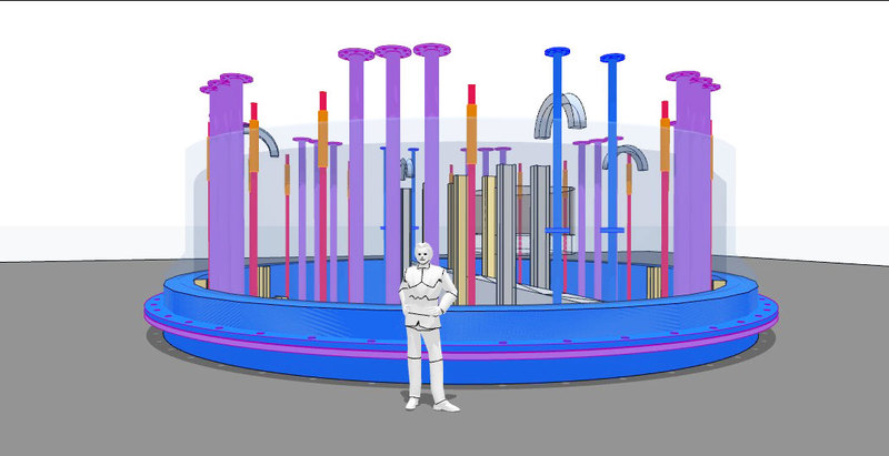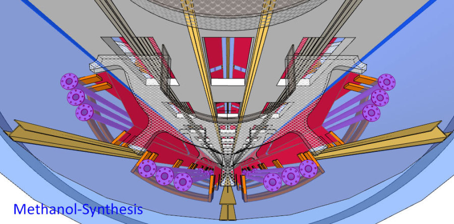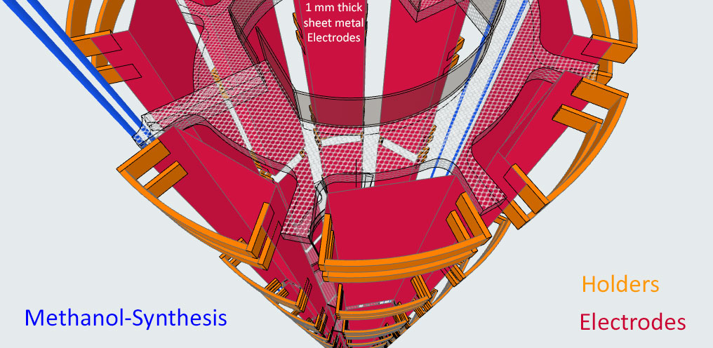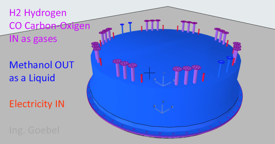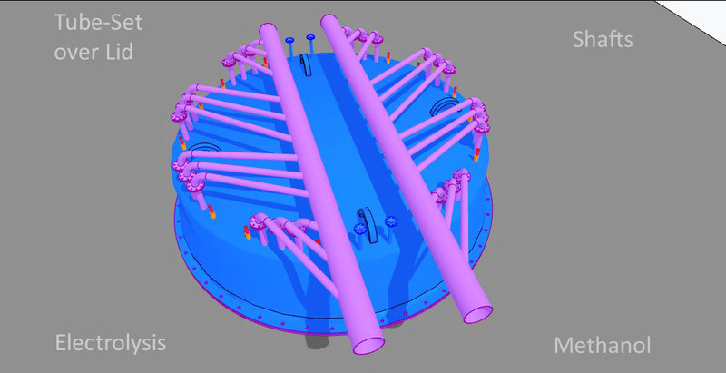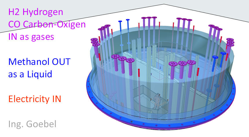 Die verwendeten Bleche auf den Anoden und Kathoden-Plätzen sind jetzt nur noch 1 mm dick und können als Widerstands-Elektro-Heizung bis 500 °C angeheizt werden - Damit wird der untere Schacht-Bereich warm und die beiden Gase können ca. 350 °C aufnehmen. - Die DN 200 Rohre in lila, es sind 12 Stück dienen zur Einleitung von H2 Wasserstoff und CO2 CO oder sogar Kohlenstaub. In den langen Ofen haben die beiden Gase Zeit sich zu vermischen, aufzusteigen, zu erkalten und sich an den Wänden als Methanol niederzuschlagen. Das Methanol läuft dann aus Schwerkraft selbst nach unten wo sich erst einmal eine mächtige Methanol-Säule bildet die nach oben hin abgepumpt werden muss. Methanol ist ein Treibstoff den man tanken kann.