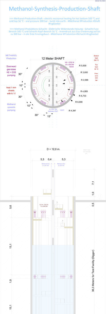 >>> Methanol-Produktions-Schacht - Elektrische Widerstands Heizung - Schach-Fuss-Bereich 500 °C und Schacht-Kopf-Bereich 56 °C - Innendruck aus Gas-Erwärmung auf bis zu 300 bar - in die Erde hineingebaut - #Methanol #Produktion #Schacht #IngGoebel