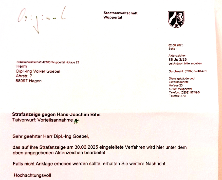 Straf-Verfahren gegen den HEG mbH GF H-J. Bihs eingeleitet - siehe Brief.